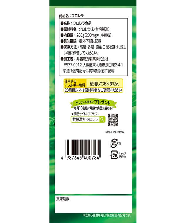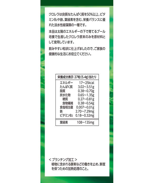 Tảo lục Chlorella là loài thực vật có hàm lượng diệp lục tố cao nhất hành tinh, cao gấp 10–50 lần so với các loại thực vật thông thường, giàu chlorophyll, β-glucan, vitamin B12, sắt, canxi, kali, CGF (Chlorella Growth Factor) và hơn 60% protein thực vật. Được nuôi trồng theo quy trình nghiêm ngặt theo hệ thống Photobioreactor – áp dụng công nghệ sinh học siêu sạch – kháng khuẩn hiện đại, kiểm soát hoàn toàn điều kiện ánh sáng, nước, nhiệt độ và không khí. Nhờ đó, mỗi tế bào tảo đều giữ được trọn vẹn hàm lượng dưỡng chất CGF (Chlorella Growth Factor) – yếu tố tăng trưởng tự nhiên giúp phục hồi và tái tạo tế bào...Đặc biệt, Tảo lục Chlorella đạt chứng nhận JHFA (Hiệp hội Thực phẩm Chức năng Nhật Bản) – cam kết chất lượng, an toàn cho sức khỏe người dùng.